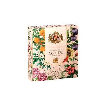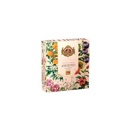 Assorted tea bags: Ceylon green leaf tea, hibiscus flowers, raspberry and vanilla aroma / Ceylon green leaf tea, hibiscus flowers, cherry, vanilla and cream aroma / Ceylon green leaf tea, hibiscus flowers, fruit, vanilla and sugar / Ceylon green leaf tea, hibiscus flowers, chocolate, cherry and cream flavor. 40 pcs.